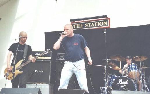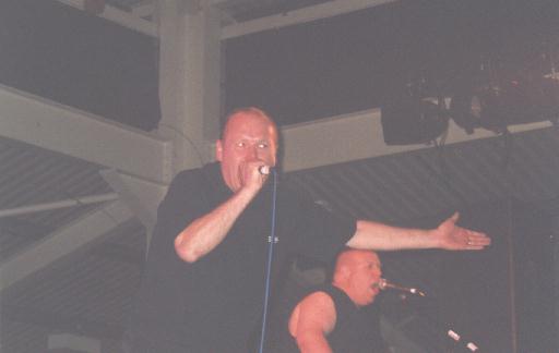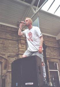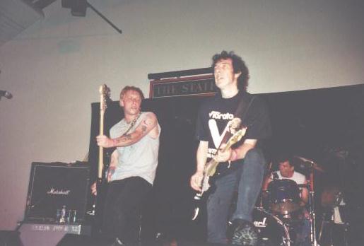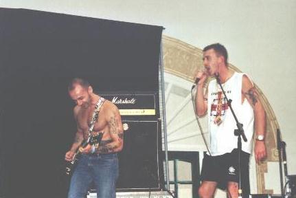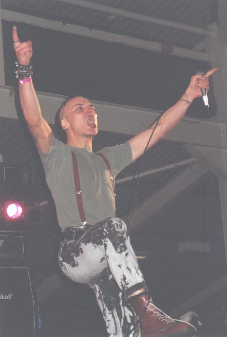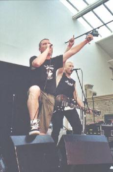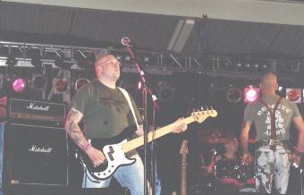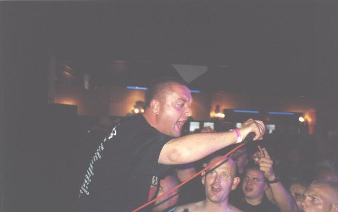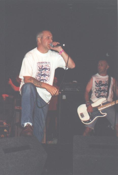 | Leider hatten sich auch an diesem Abend wieder einige dieser Birnen im Dome eingefunden die, offensichtlich durch einen Typen animiert, der die halbe Geschichte des 3. Reiches auf seinen Rücken tätowiert hatte, meinten ihre politische Ausrichtung durch den ausgestreckten rechten Arm kundtun zu müssen.(Ein Photo der Tätowierungen dieses Typen habe ich mir erspart, da unsere Seite ansonsten sicherlich reif für den Index gewesen wäre. Nur soviel sei zu den Motiven gesagt. Zu sehen waren der hässliche Irre mit dem kleinen Bart und dem schmierigen Seitenscheitel, natürlich grüßend, dann sein debiler Stellvertreter, einige Sturzkampfbomber, eine Klansmütze und noch einiger anderer Unsinn. Wenn das kein Geschichtsbewusstsein ist.) | | Abgesehen von den paar Boneheads, durch die sich weder Kev und die Jungs von „Condemned 84“ noch der Rest des Publikums weiter stören ließen, war der Auftritt der Band allerdings mal wieder absolut genial und „Condemned 84“ kamen dieses Mal sogar noch besser rüber, als bei ihrem letzten Auftritt beim HIS in Morecambe vor zwei Jahren, zumal sie auch dieses Mal wesentlich besser ausgesteuert waren. |
