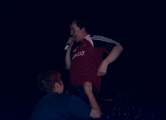 Um da noch eins drauf zu setzen mußten schon die Lokalmatadore auf die Bühne. Und was soll ich da lange herumreden, die Mühlheimer waren wie üblich genial. Die Jungs spielten ihre Hits rauf und runter, daß es mal wieder eine helle Freude war und auch die weiblichen Fans waren an diesem Abend wieder kaum zu halten und gingen dem Fisch ordentlich an die Wäsche. | ![]() "Dicke Titten" Die Lokalmatadore |