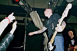 Eigentlich hatte ich mir vorgenommen, daß dieses Konzert von The Business vorerst das letzte für mich sein sollte. Ich hatte die Engländer betreits so oft gesehen, daß mich eine Ankündigung ihrer Konzerte nun wirklich nicht mehr gerade vom Hocker reißen konnte. O.k., die "Under The Influence" war den Jungs ziemlich gut gelungen, aber live hatte ich neben einigen übelst genialen Auftritten, wie dem in Morecambe vor einigen Jahren, auch schon relativ derbe Abstürze bei den Engländern erlebt. So waren denn auch eher die Auftritte von Deadline und Toxpack der Antrieb, um mir wieder mal eine Nacht im Eiskeller um die Ohren zu schlagen. Letztere schon deshalb, weil mich das Konzert von Toxpack in Berlin letztes Jahr beim Punk And Disorderly Festival einfach davon überzeugt hatte, daß die Jungs auch live richtig gute Musik abliefern und erstere, weil man beiīnem Konzertbesuch eines Deadline Gigs eigentlich nix verkehrt machen kann. So pilgerten denn an diesem Abend auch wieder mal erfreulich viele Leute in den Eiskeller, unter denen sich, anders als bei den letzten Konzerten, auch `ne Menge bekannter Gesichter befanden, so daß man die Wartezeit bis zum Auftritt von Tockpack prima mit dem einen oder anderen Schwätzchen totschlagen konnte. |
