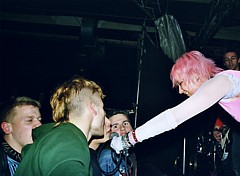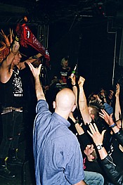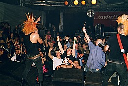 Leatherface machten musikalisch gesehen zunächst auch Žnen ganz ordentlichen Eindruck und lieferten recht annehmbaren, melodischen Punkrock ab, der teils etwas an die späten Hüsker Dü erinnerte, insgesamt für meinen Geschmack doch schon etwas zu seicht war, aber dennoch von den meisten Anwesenden ziemlich geschätzt wurde. Offensichtlich waren die drei an diesem Abend allerdings nicht nur darauf aus, Musik zu machen, sondern auch darauf, sich Žne Keilerei mit dem Publikum zu liefern. |